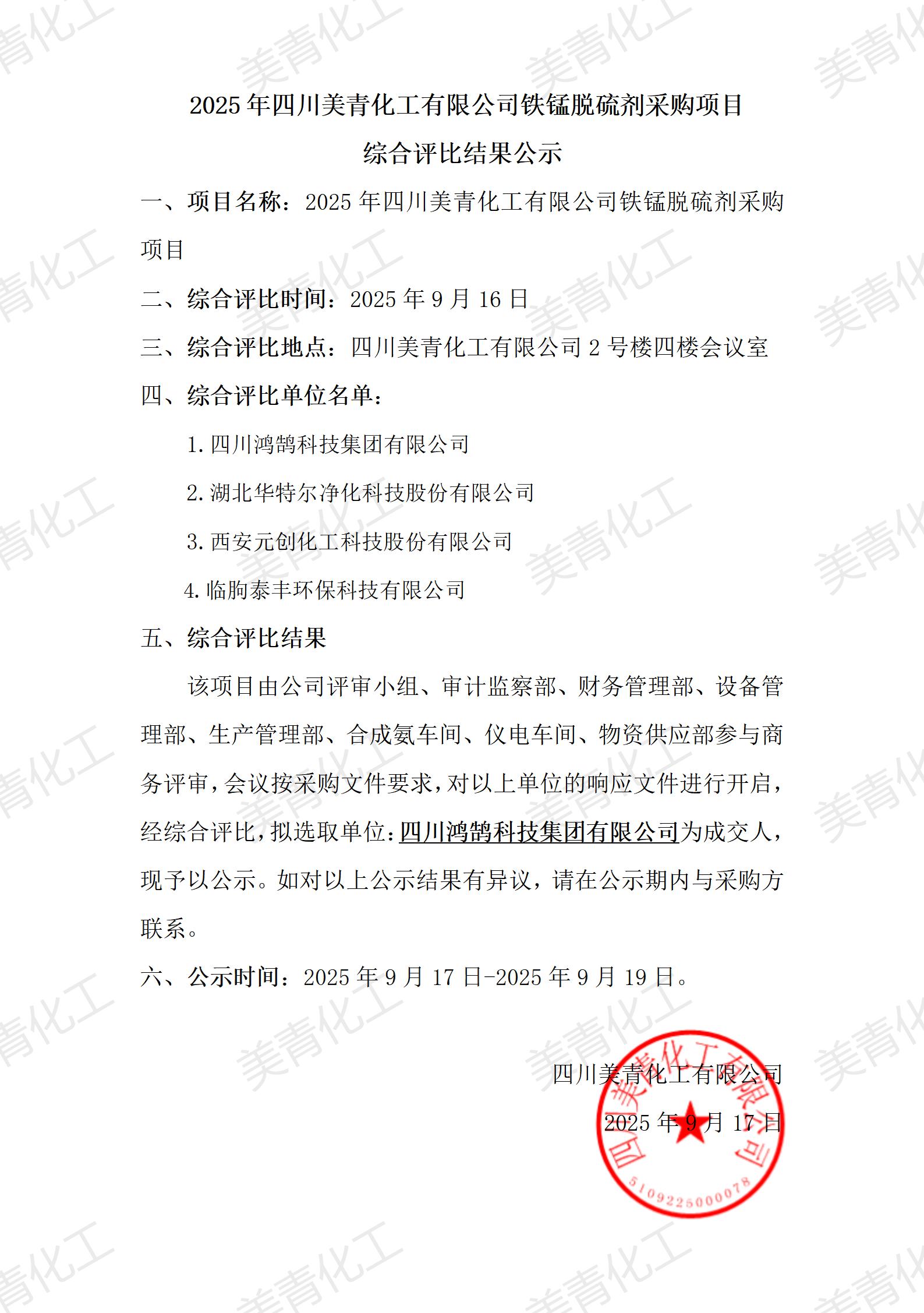 2025年四川美青化工有限公司鐵錳脫硫劑采購(gòu)項(xiàng)目綜合評(píng)比結(jié)果公示