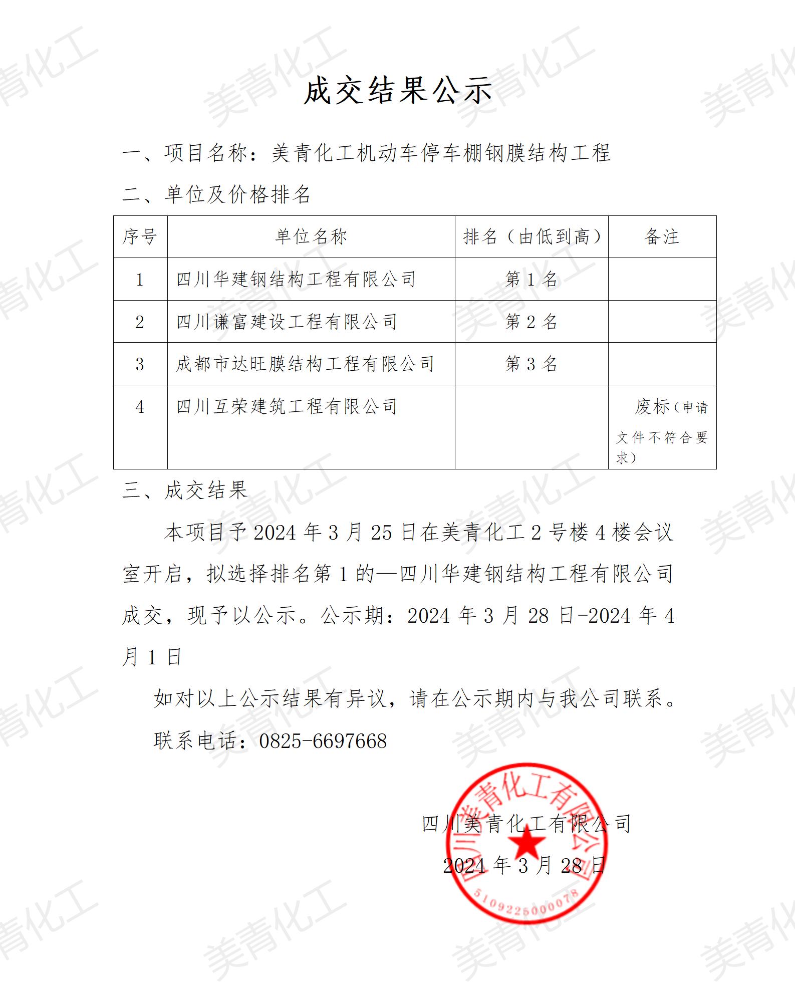美青化工機(jī)動(dòng)車停車棚鋼膜結(jié)構(gòu)工程成交結(jié)果公示