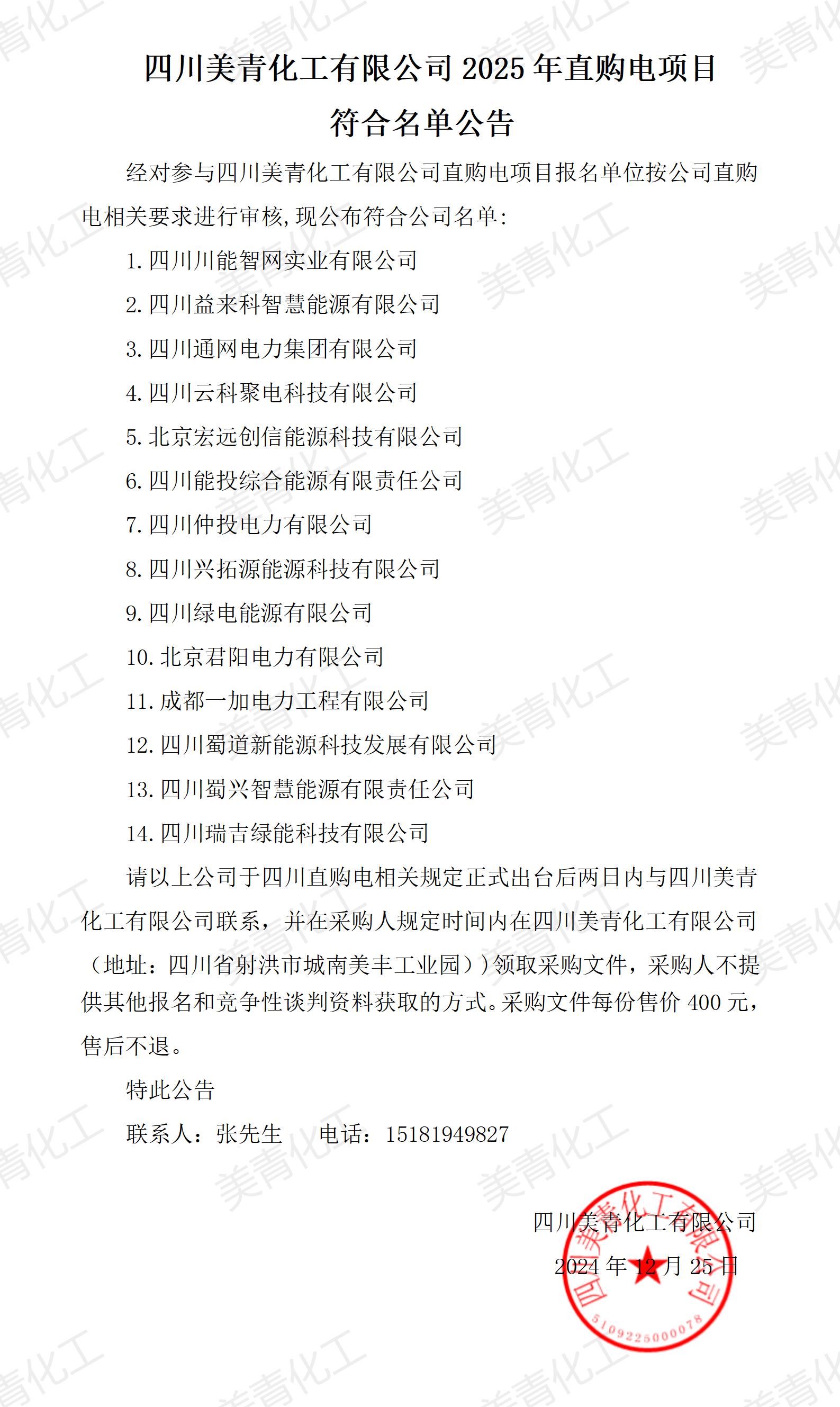 四川美青化工有限公司2025年直購(gòu)電項(xiàng)目符合名單公告