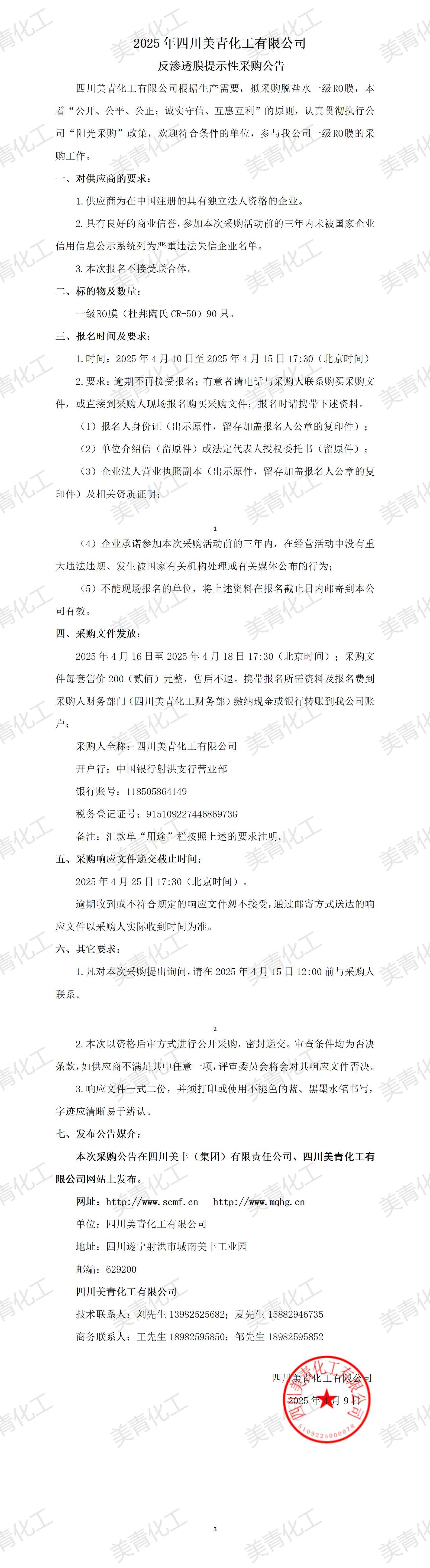 反滲透膜提示性采購公告